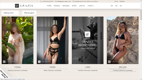 Grazia Escorts can provide high class escort services in Berlin with their selection of beautiful ladies. Their website is user-friendly, featuring detailed profiles for each escort on offer with blurred photos (all on one page), stats, descriptions of what services she can provide to you as well as what services each one can provide you.